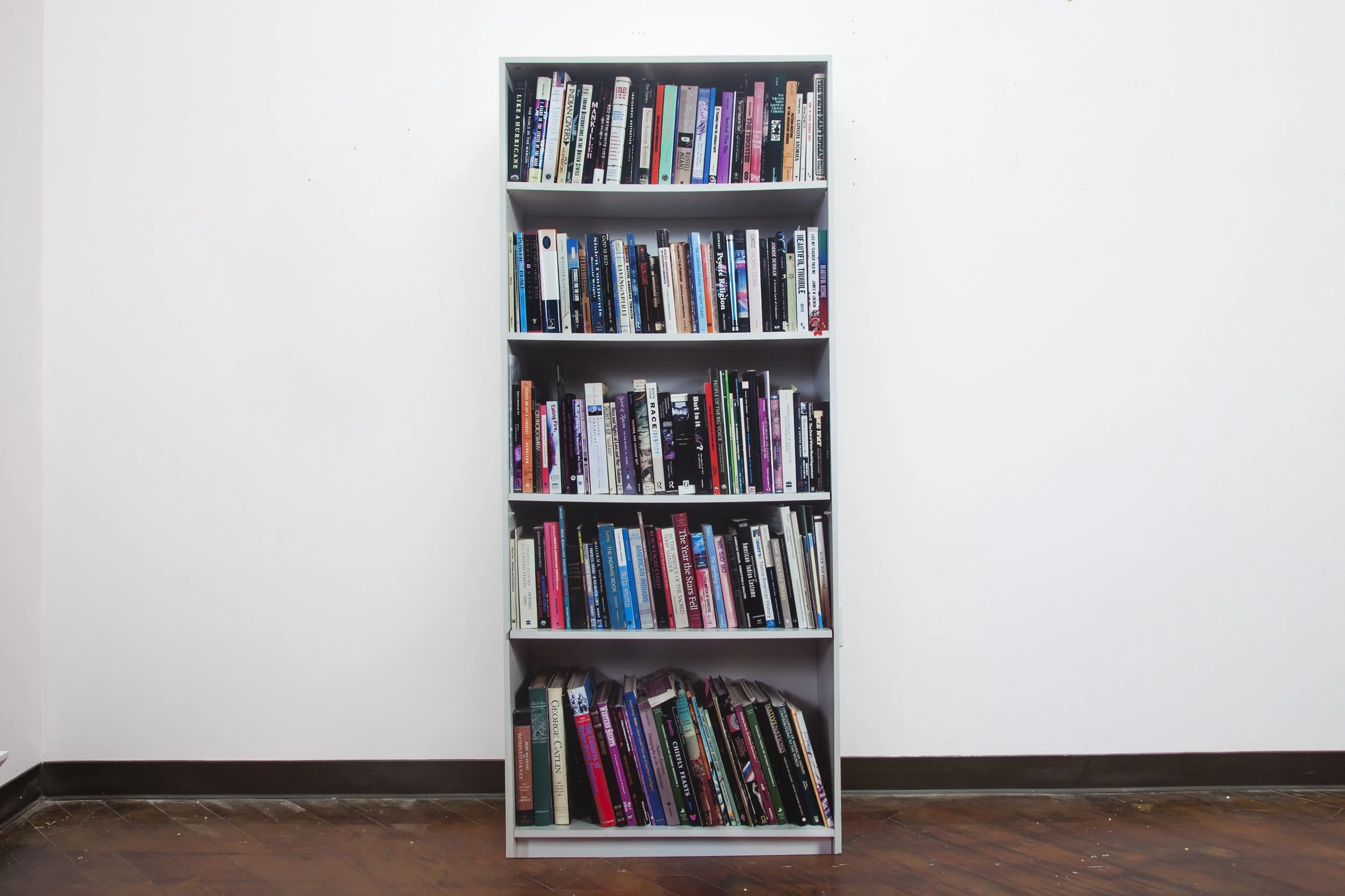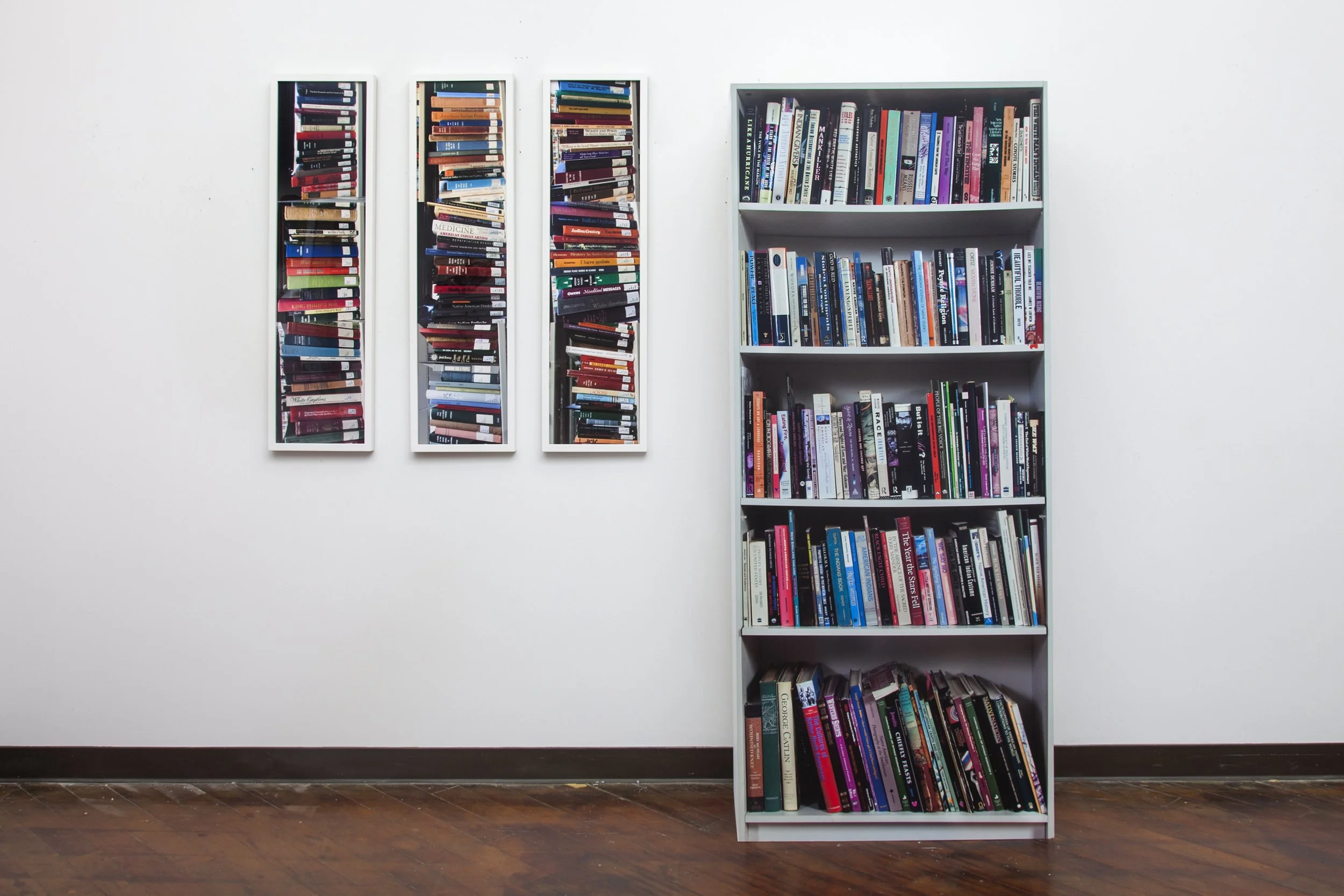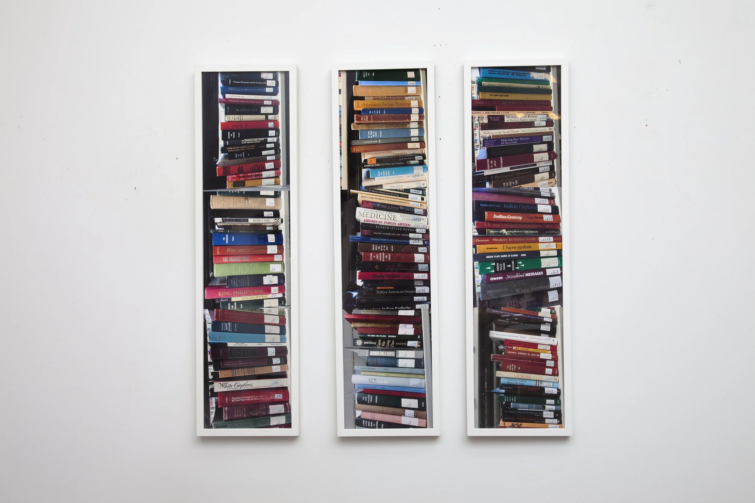The earlier work, The Sum of All Knowledge, was realized in 2016 as part of a collaborative exhibition titled Finding Metacom (pictured below). The three digital photos are part of a documentation of all the books on Native American culture from the library at the University of Northern Iowa in 2012.